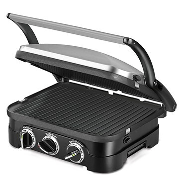 Brushed stainless-steel housing; sturdy panini-style handle; floating cover to adjust to thickness of food