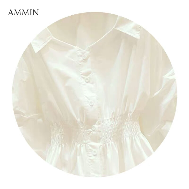 AMMIN Tops 2021 autumn new style V-neck long-sleeved button cardigan cotton shirt women's Korean version of retro Hong Kong flavor elastic waist Western-style loose lantern sleeves solid color blo