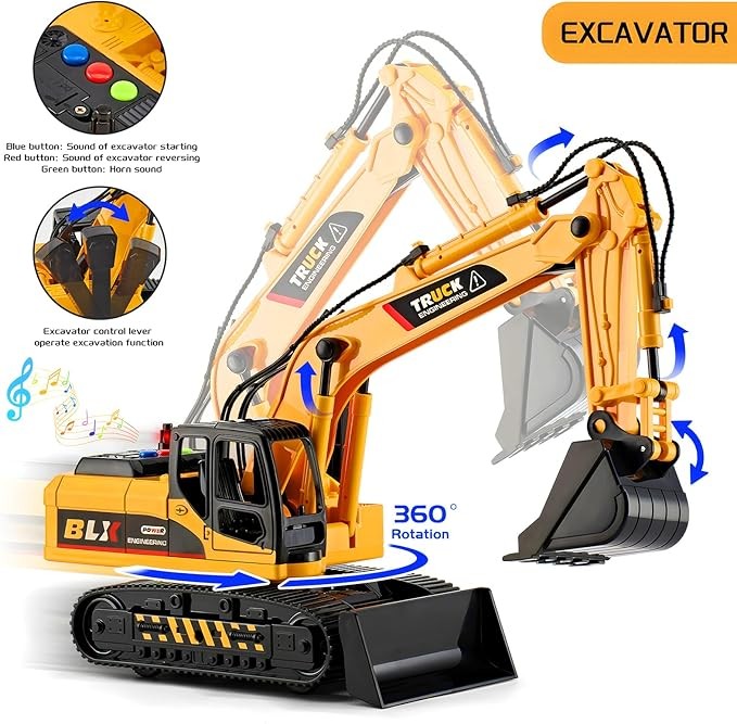 • Interactive Features: The excavator has a 360° rotating cab and a manipulable digging arm via the side lever, enabling realistic scooping. the dump truck allows kids to lift and lower the rear bed by Continuously press the up button on the top of the car and the down button on the fuel tank position, and it comes with 20 plastic stones for loading and unloading action.