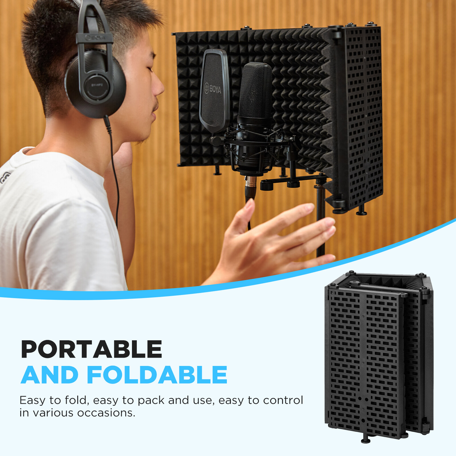 The BOYA BY-RF5P is a foldable microphone isolation shield, it help to reduce the reflection and noise effectively during recording, gathering a clear high-quality sound from home recording studio, live streaming, or professional vocal recording.