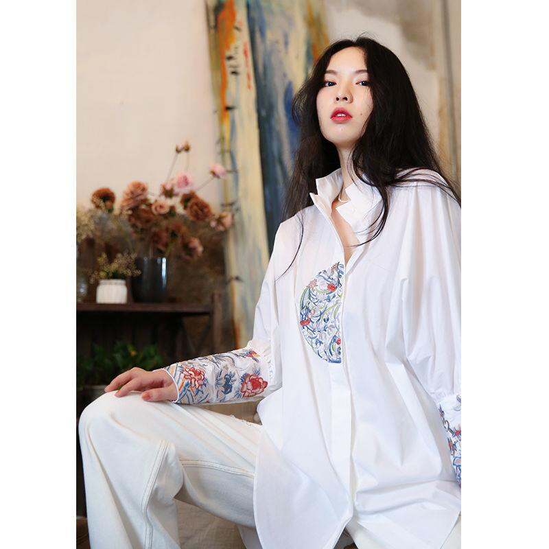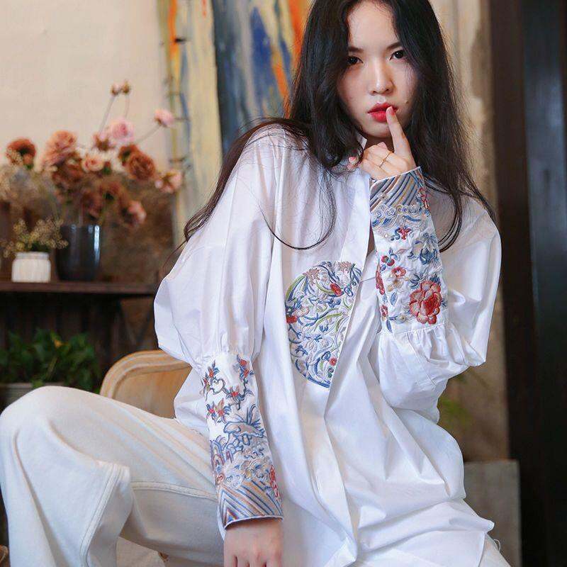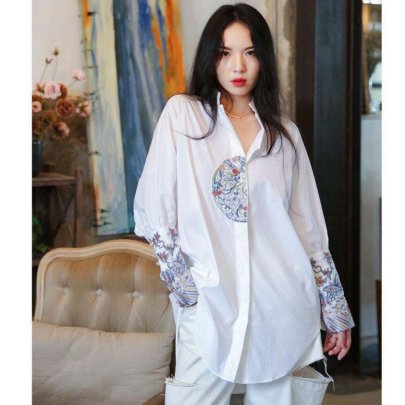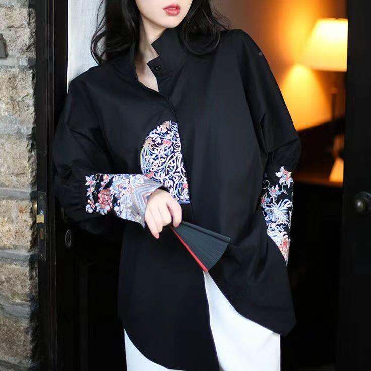 Chinese Style Retro Heavy KDG Embroidered Shirt Top 2 Long 022 Spring New Style Women 'S Stand Collar Width Medium Length Loose