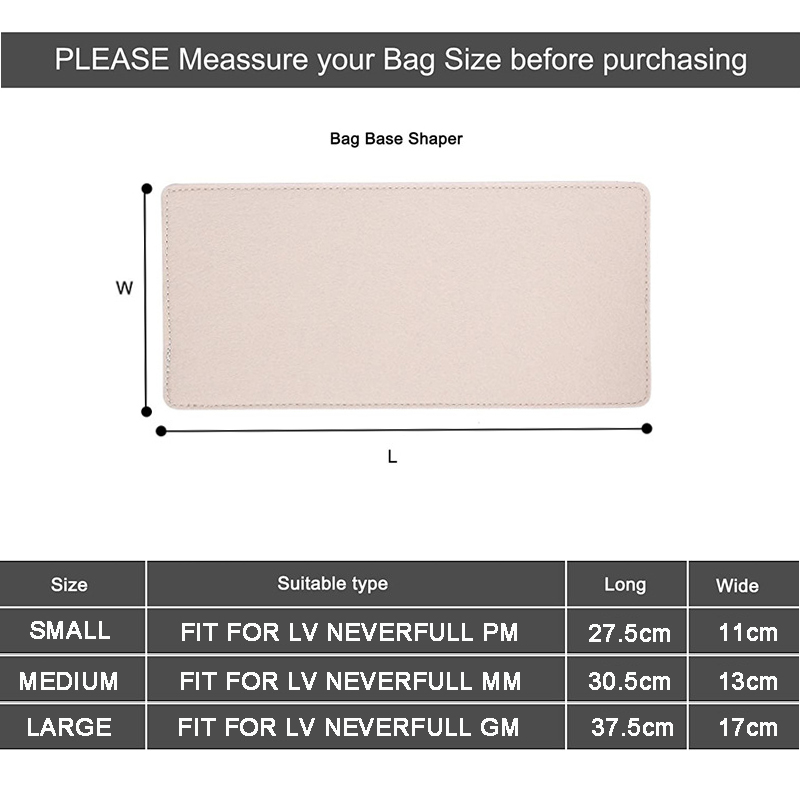 Product Dimensions: S: 27.5X11cm, fit for LV Neverfull PM; M: 30.5X13cm, fit for Neverfull MM;L:37.5X17cm,fit for LV Neverfull GM
