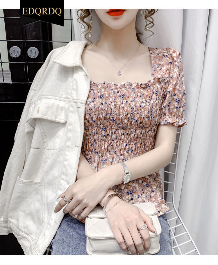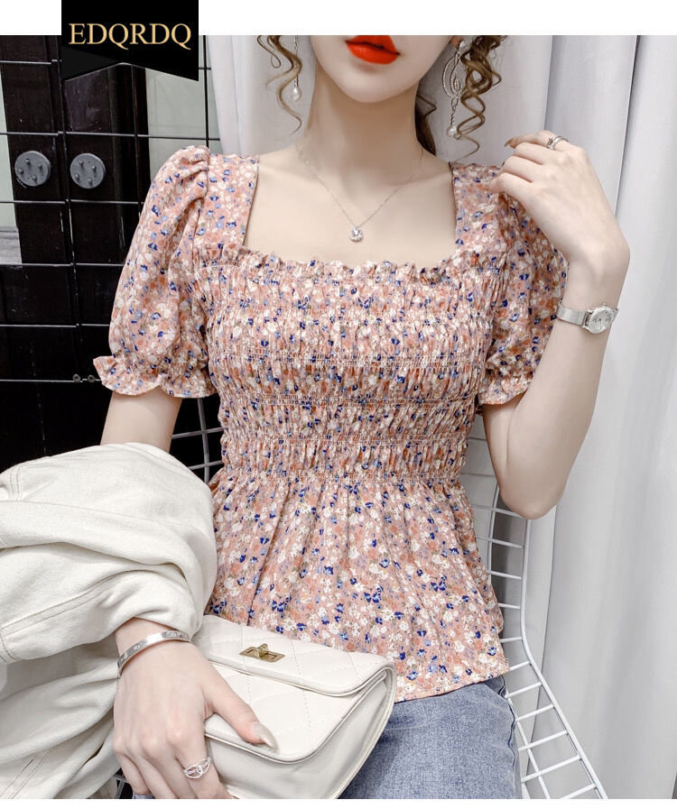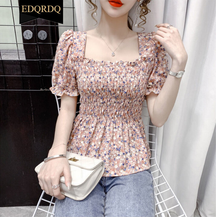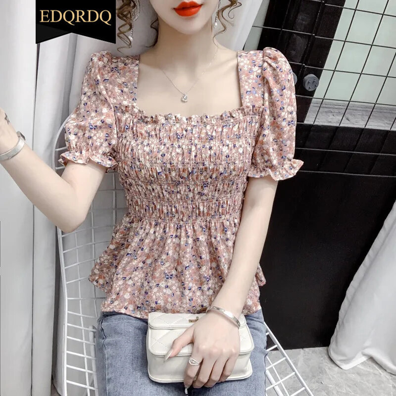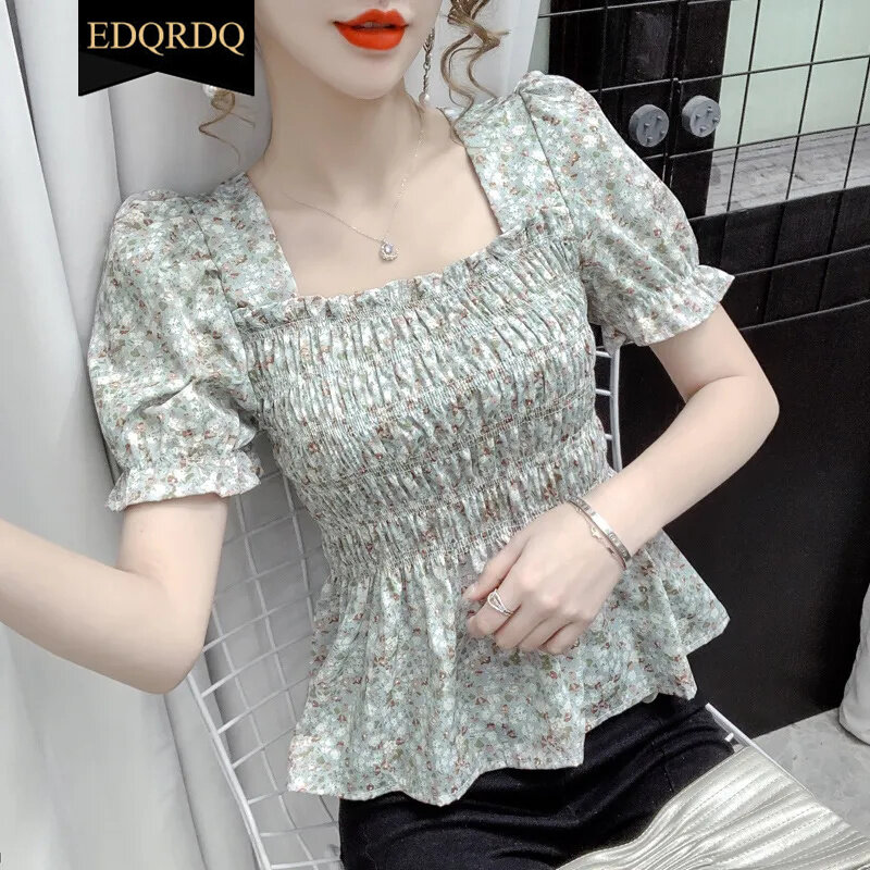 EDQRDQ Women's Floral Print Sexy Frill Smock Crop Top Square Neck Vintage Peplum Short Sleeve Shirred Blouse Top