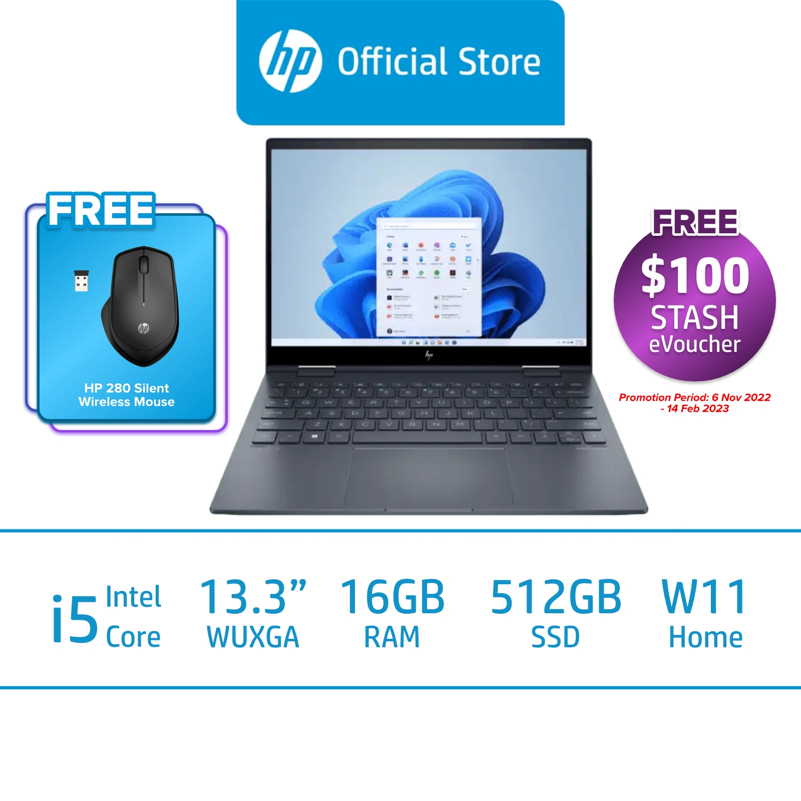 HP ENVY x360 2-in-1 Laptop 13-bf0066TU / Intel Core i5-1230U / Intel Iris X Graphics / 16GB RAM / 512 GB SSD / 1 Year Limited Warranty / McAfee LiveSafe Included / Multi-touch screen