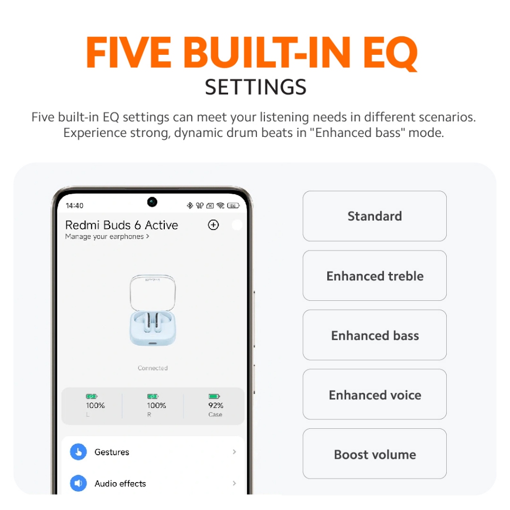 ?【Five EQ Settings】Customizable sound via the Xiaomi Earbuds app.