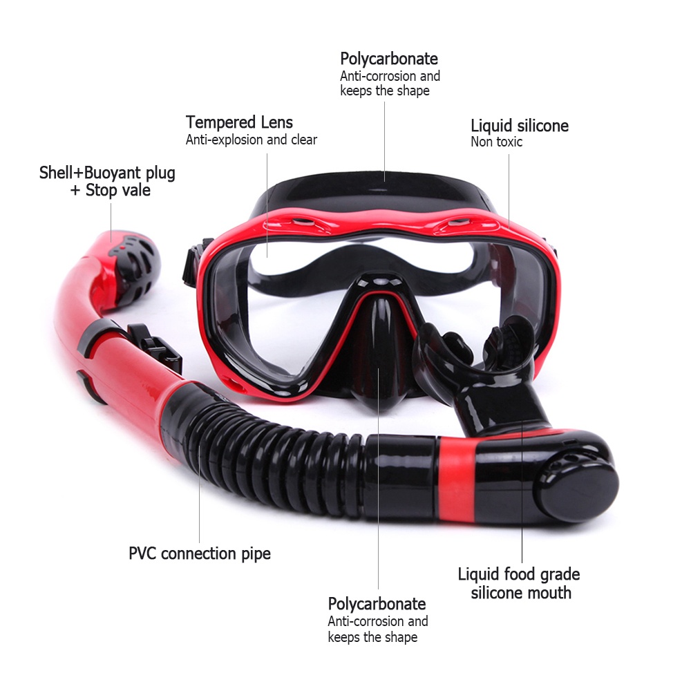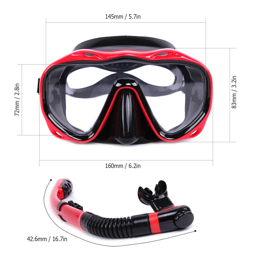 This snorkeling set for adults comes with fully adjustable head straps and a high-grade silicon face skirt which molds to fit virtually any face shape. The ribbed design provides extra support and ensures a water-tight seal. Perfect for swimming, diving, snorkeling or other underwater activitiesFeatures:Tempered glass mask,high temperature resistant,not easy to be broken.Soft silica gel material,safe and reliable.Strap with adjustable buckles for quick and easy adjustment.Two-way drainage port,conveniently drain the water away.Full dry pipe head can prevent the water into the breathing tub.Great for swimming, diving, snorkeling or other underwater activities.Specification:Material: Silicone + Tempered Glass LensColor: Black / Red / Dark Blue(Optional)Mask Size:160 * 83mm / 6.2 * 3.2inLen Size:145 * 72mm / 5.7 * 2.8inSnorkel Length: 42.6mm / 16.7inPackage size: 55 * 48cm / 30.3 * 18.8inPackage weight: 400g / 14.1ozPackage List:1* Diving Mask1* Snorkel