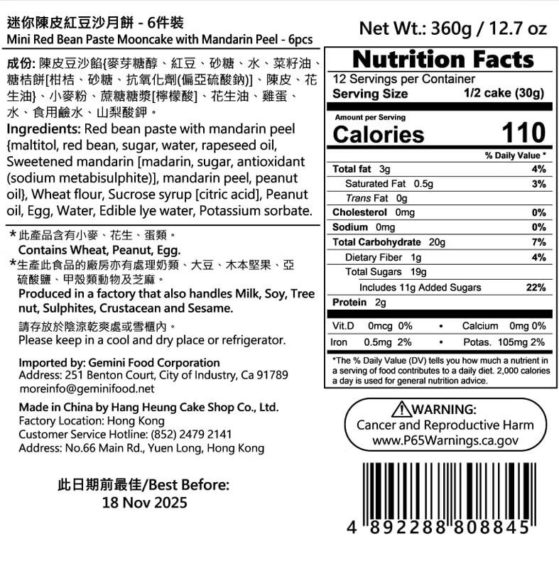 Hong Kong Hengxiang Mini Tangerine Peel and Red Bean Paste Mooncakes (6 pieces) [A Time-Honored Brand, Must-Buy in Hong Kong]