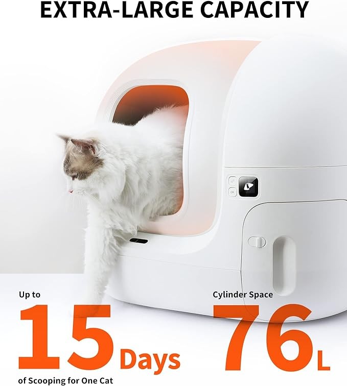 • Extra Large Capacity for Large Cats and Multi-cat Family: Size of the inner bucket: 18.89 x 20.47 inch(diameter), 76L large space is enough for cats up to 18 lbs,7L large waste bin allows up to 15 days of free scooping for one cat. The 7.8 inch low-entry design is friendly to older cats, short-legged cats, and cats with limited mobility.